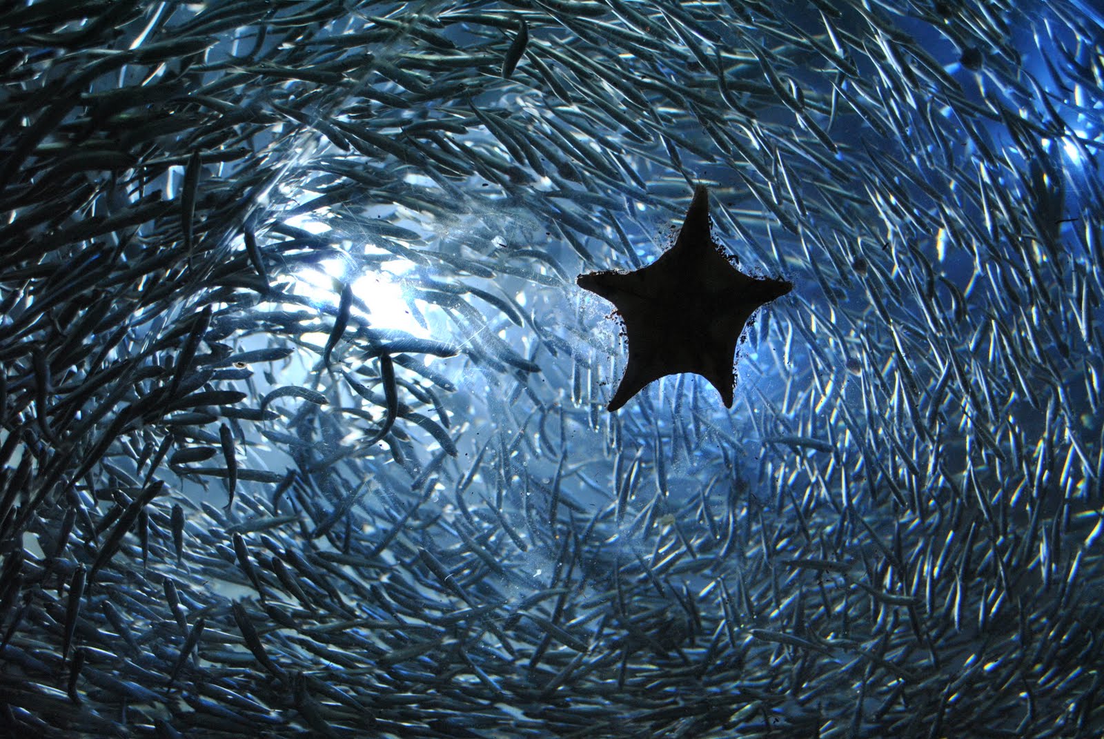 Date: 4 Jun 2012 01:15 pm (UTC)It was cloudy, but the sun managed to pierce the banks just as it was setting behind some trees. Wind was tossing the trees narrow leaves, and it looked just like a school of sardines darting and swirling across the sun. It looked something like this, minus the starfish and the scratches on the aquarium (in other words, a lot prettier, but I tried to find a pic with the light behind the fish :P ) :